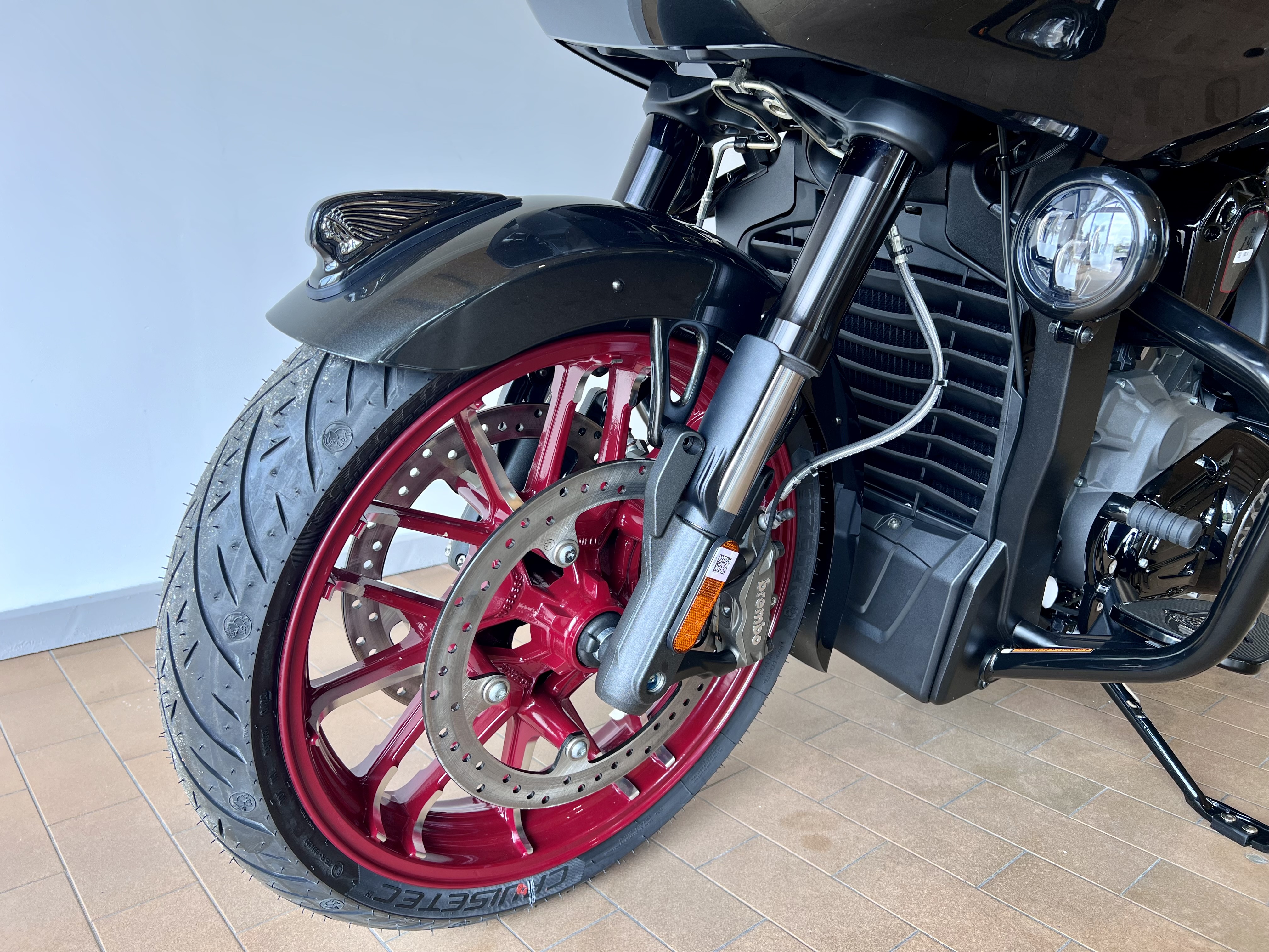 Vorderrad: Metzeler Cruisetec 130/60B19 66H, Sport Contrast Cut mit Indian Red Pin Stripe 19" x 3.5"